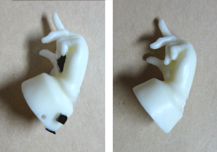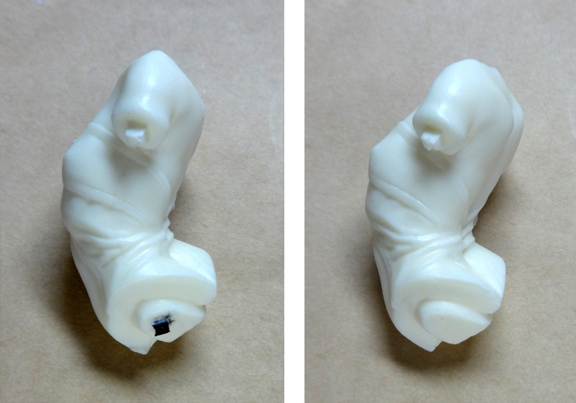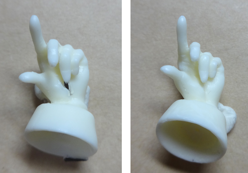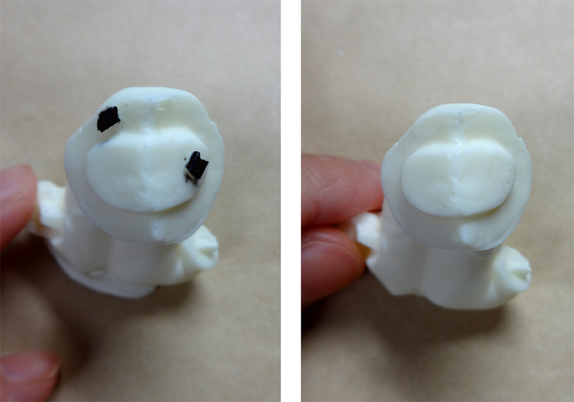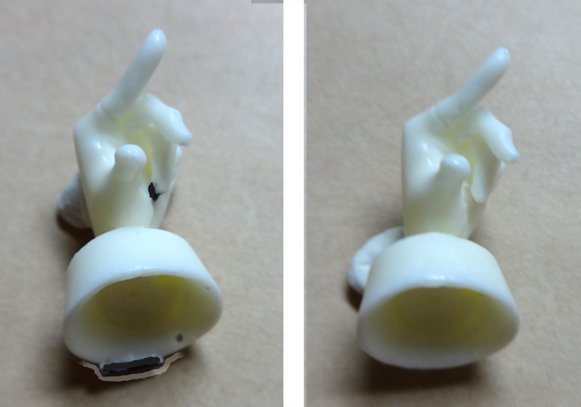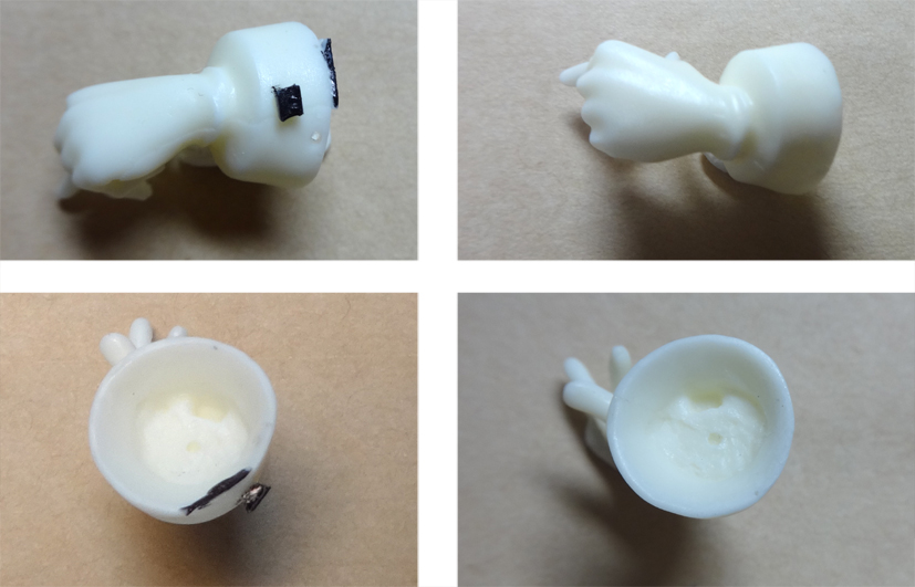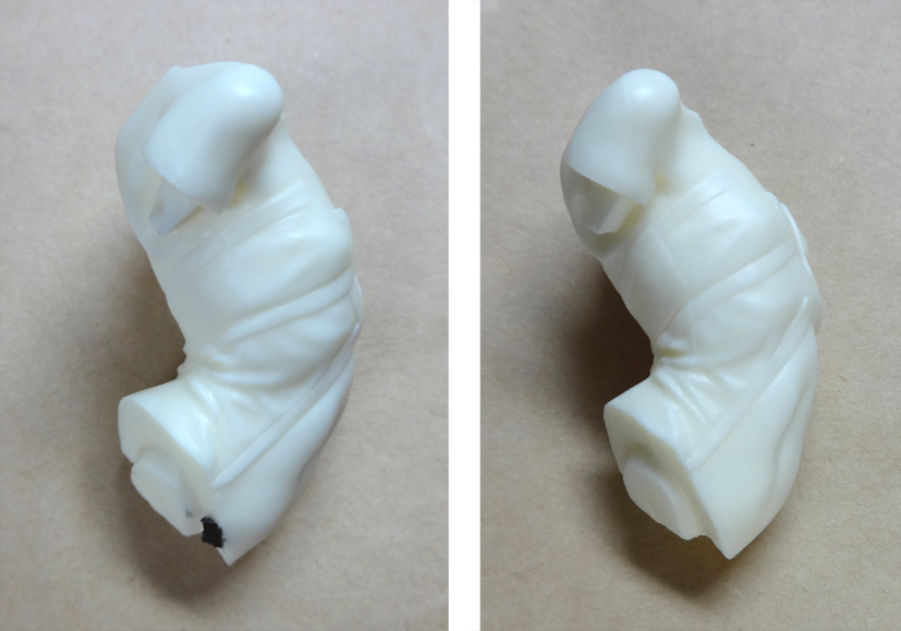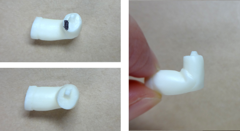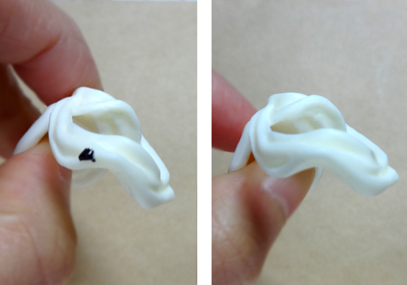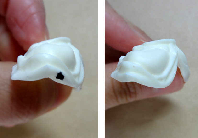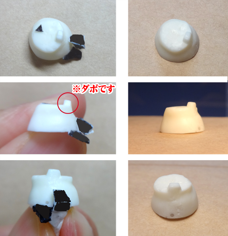 ゲートをニッパーでカット(図中央参照)し、ナイフで削ってください。