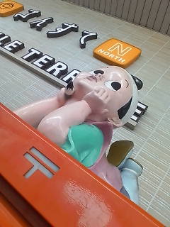 ↓岡山駅にある、むっちりな桃太郎が乗ったポスト