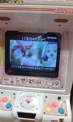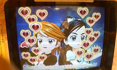 このドリームライブVer.の最大の特徴はレアカードとマックスハートのキャラカードが結構出ることです(私らが使った台調べ)。14枚中4枚がレアカードでマックスハートキャラが5枚でました。